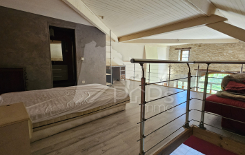 La mezzanine de 28 m² surplombe élégamment le séjour et abrite aujourd’hui une suite parentale indépendante avec salle d’eau privative, pouvant aussi devenir bureau ou espace détente.