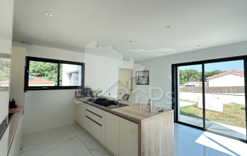 La pièce de vie baignée de lumière, ouverte sur le jardin par de grandes baies vitrées, accueille une cuisine intégrée élégante et fonctionnelle.