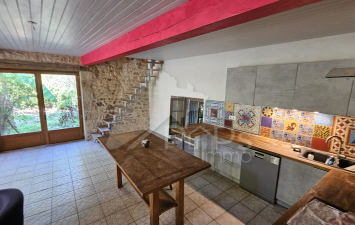 La cuisine ouverte, aménagée et équipée, s’ouvre sur l’extérieur, idéale pour les repas en terrasse durant les beaux jours.