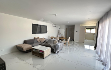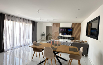 La pièce de vie baignée de lumière, ouverte sur le jardin par de grandes baies vitrées, accueille une cuisine intégrée élégante et fonctionnelle.